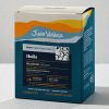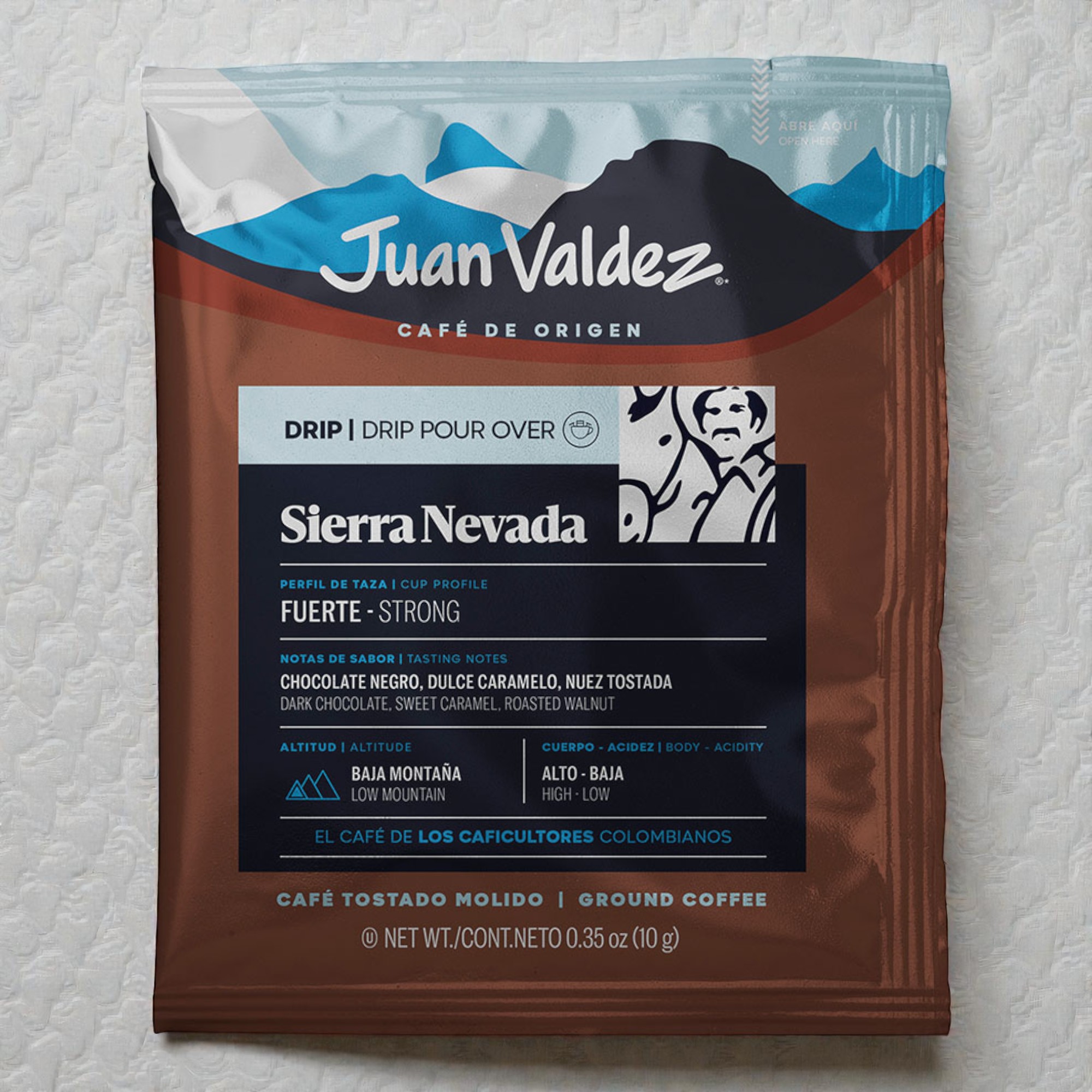 Juan Valdez Sierra Nevada drip coffee in convenient sachets. Strong coffee profile with low acidity. Cup Profile: Strong (100%). Acidity: Low (10%). Flavor notes: Dark chocolate, sweet caramel and roasted walnut. 100% Colombian Arabica coffee, premium quality, naturally roasted. 5 sachets per box.